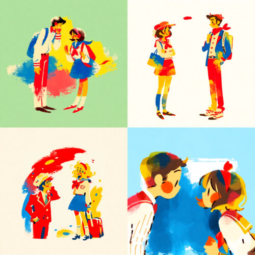 ザクザクとした粗い筆跡が見える油絵アニメスタイル。大胆な構図になりやすい。