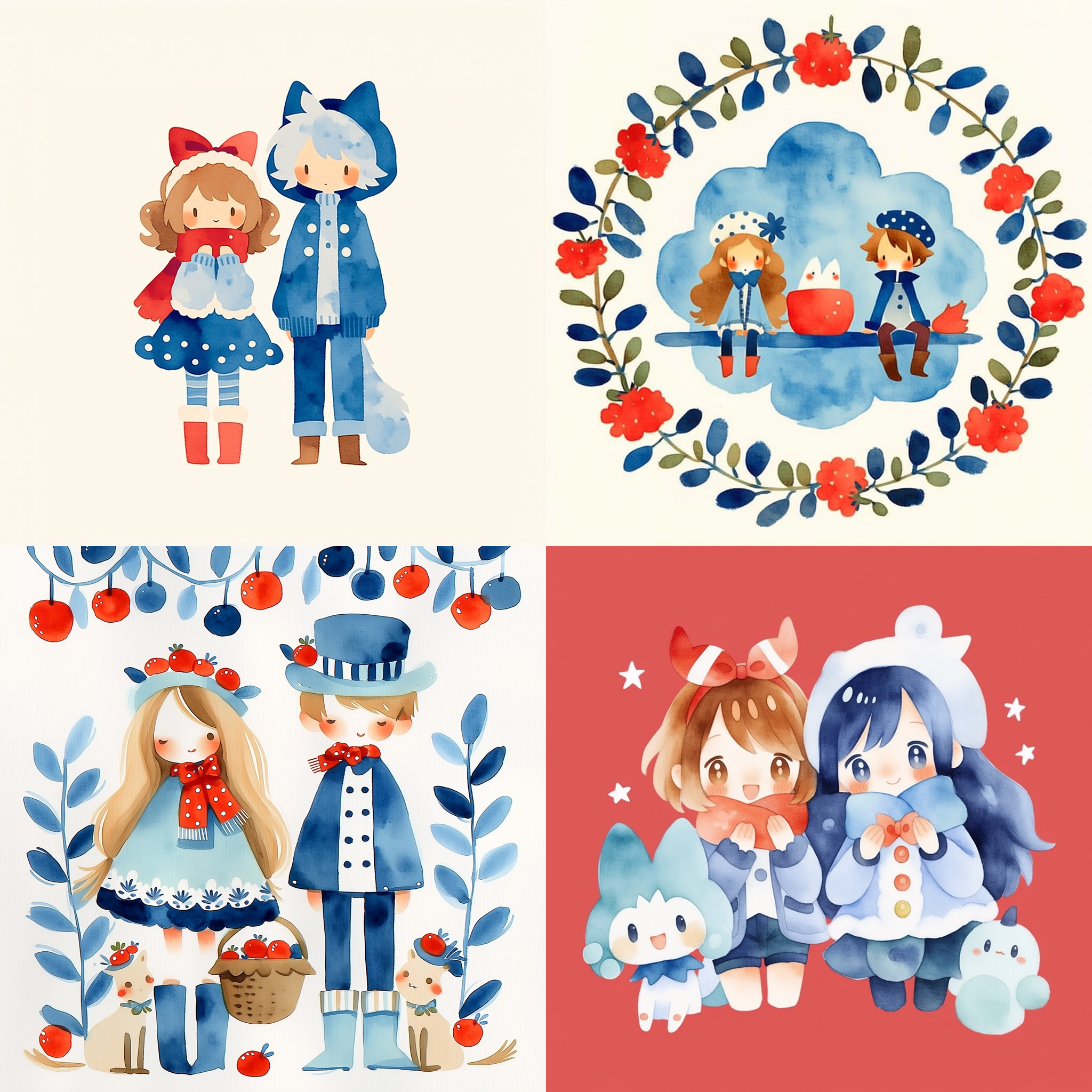 絵本風の水彩スタイル。鮮やかな赤と落ち着いた水色の対比。