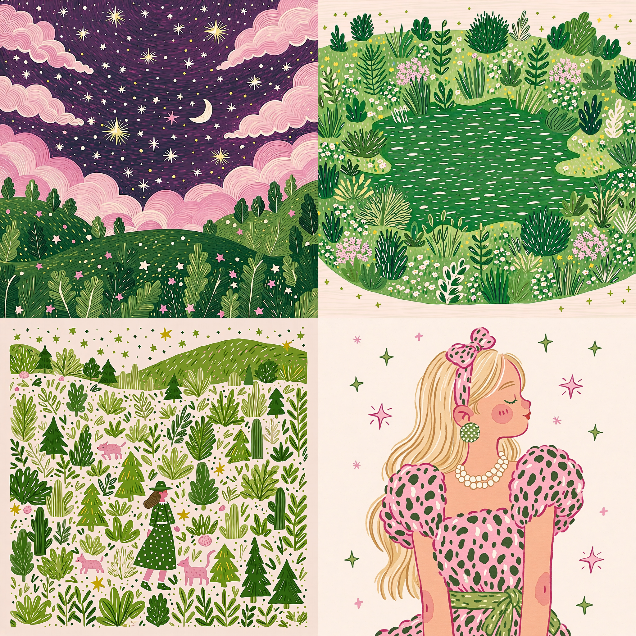 緻密な緑系イラストスタイル。植物モチーフが出やすい。